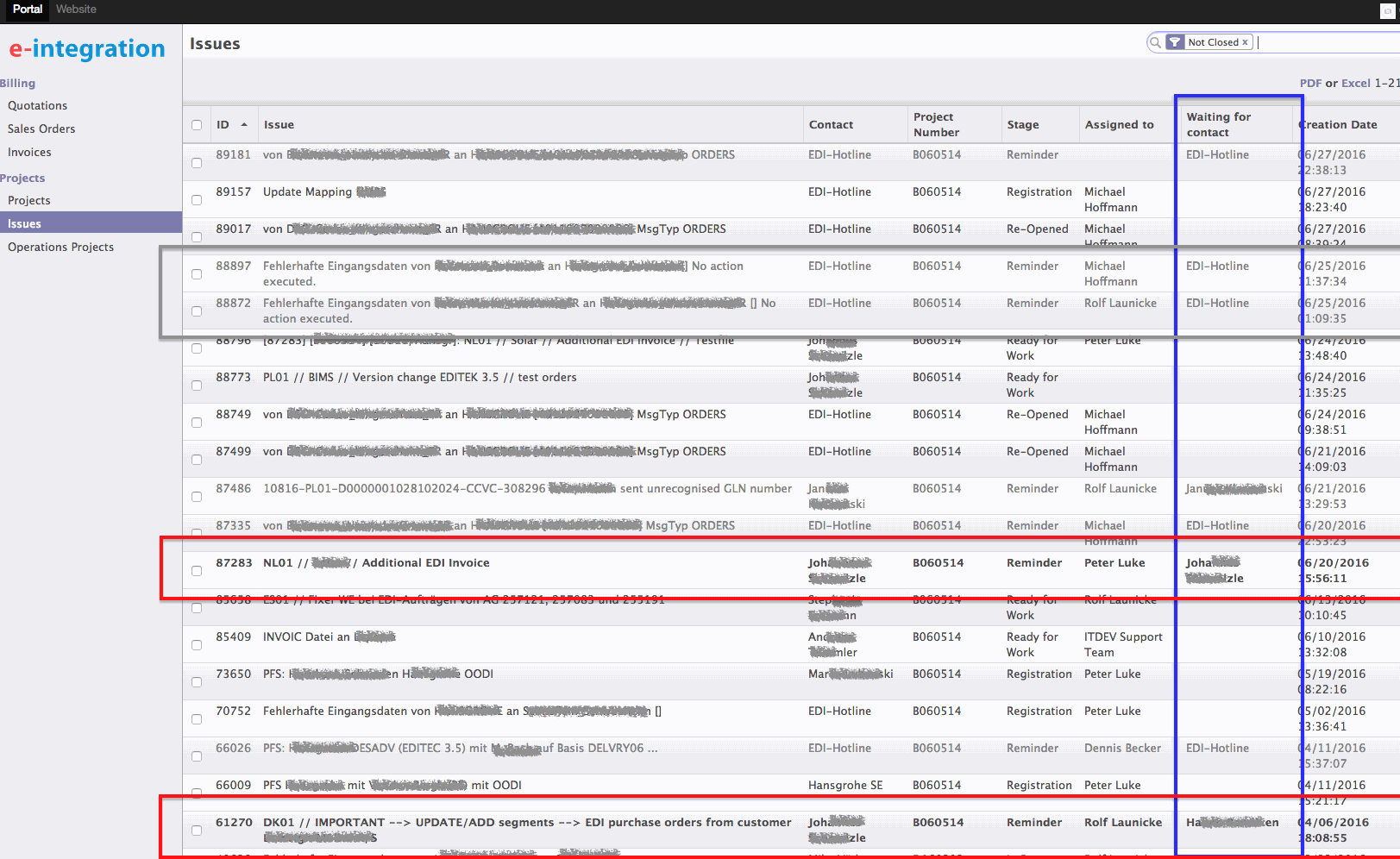 Falls wir auf Input von Ihnen warten, ist die ganze Zeile in fett gedruckt. dadurch stechen solche Fälle hervor, in denen wir Ihre Hilfe zur Bearbeitung benötigen (siehe Zeilen in Rotem Rahmen)